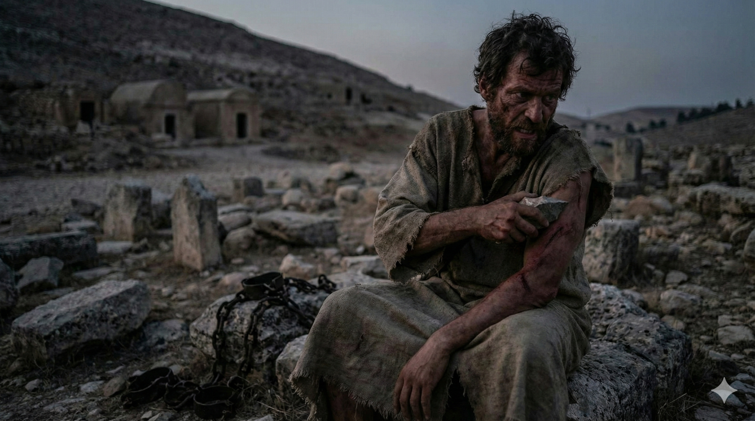 马可福音 5:5他昼夜常在坟茔里和山中喊叫,又用石头砍自己。